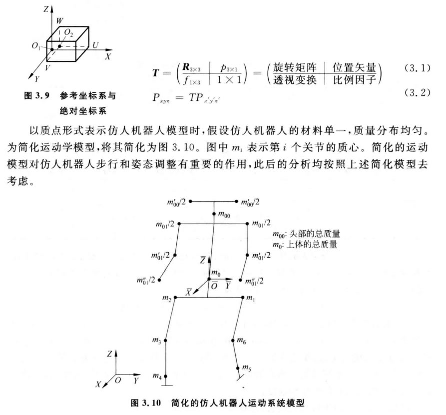 為了便于步態(tài)分析和設(shè)計(jì),建模時(shí)將軀干近似 為一個(gè)桿,不考慮肘關(guān)節(jié)運(yùn)動(dòng),兩個(gè)手臂各視為一個(gè)桿,只考慮兩 臂運(yùn)動(dòng)產(chǎn)生的水平面上旋轉(zhuǎn)力矩,在此基礎(chǔ)上建立智能接待仿人機(jī)器人的 簡(jiǎn)化運(yùn)動(dòng)模型[95]。先,在智能接待仿人機(jī)器人的腰部固連一個(gè)參考坐標(biāo) 系O₂, 再在智能接待仿人機(jī)器人步行起點(diǎn)的重心投影處建立一個(gè)相對(duì)于地 面靜止的絕對(duì)坐標(biāo)系O₁, 圖3.9為參考坐標(biāo)系與絕對(duì)坐標(biāo)系的關(guān)系示意圖。兩個(gè)坐標(biāo)系的轉(zhuǎn)換可以用下式描述: